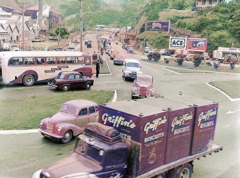 Ngauranga Gorge in the 1950s - buses, trucks, and everyday life moving at a very different pace.